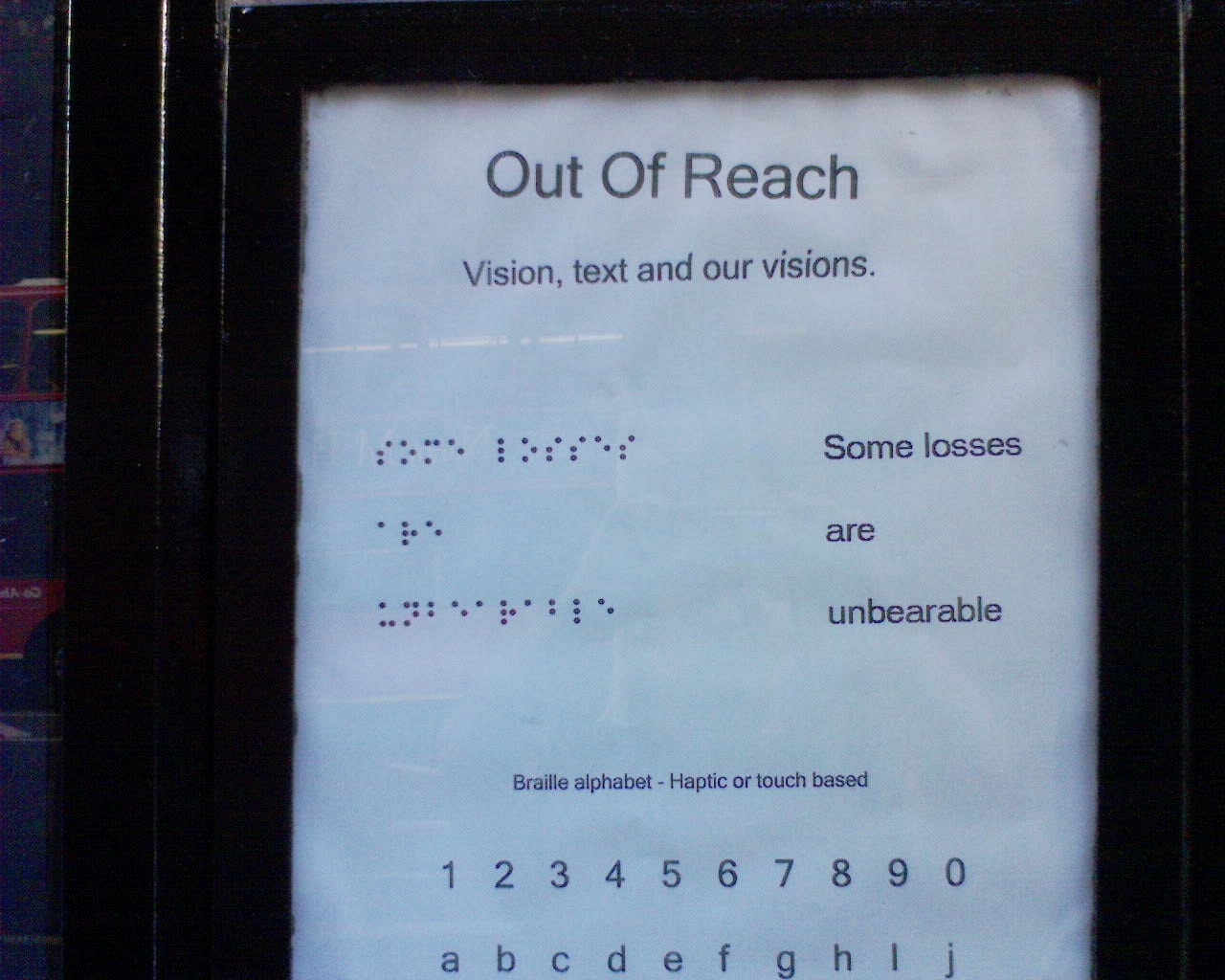 Exhibition outside the Art college on Charing Cross Road - lights spelling out braille messages behind glass. Sort of futile as a blind person can't see the light. Poignant messages though...
